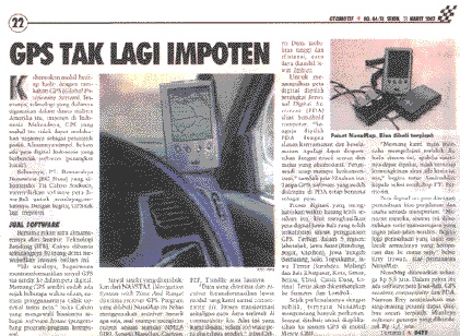 "GPS Tak Lagi Impoten" adalah berita tabloid migguan OTOMOTIF (No. 44 / Maret 2002) tentang peta digital NusaMap yang dikembangkan oleh RC NUSA sebagai langkah maju dalam penggunaan GPS di Indonesia. | ||||